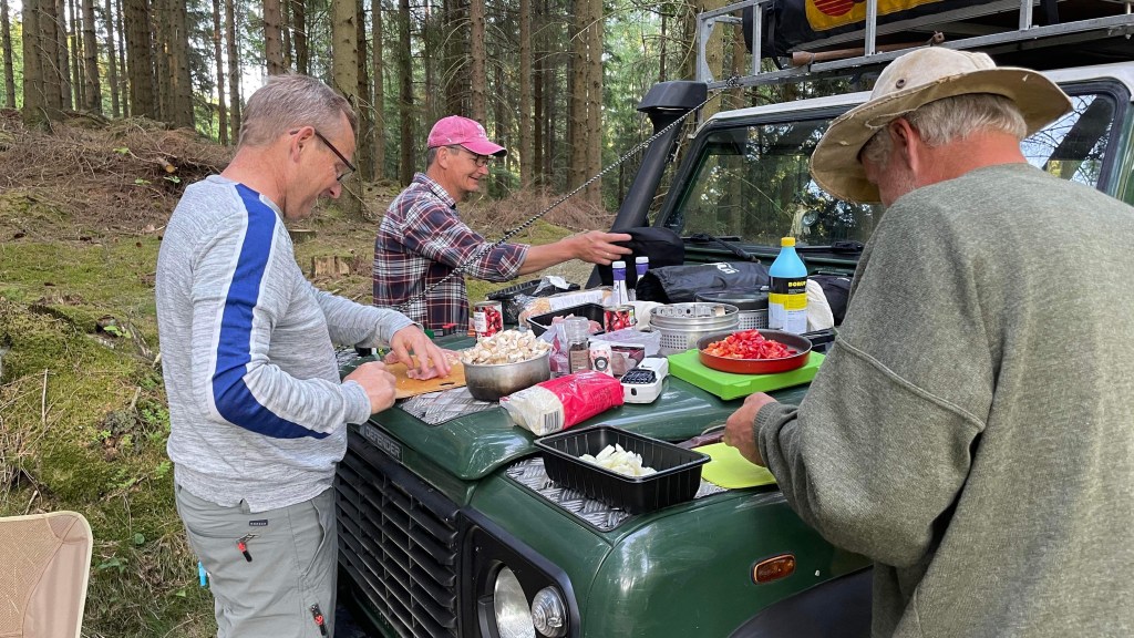 Vi kørte yderligere 15 km og fandt en plads langs en skovvej. Her var ingen mennesker og god læ for vinden. I løbet af få minutter kom alle gadgets frem, for at gøre livet mere behageligt for mænd med en anseelig rutine ud i livets udfordringer. Det grå guld var meget sigende for gruppens look.