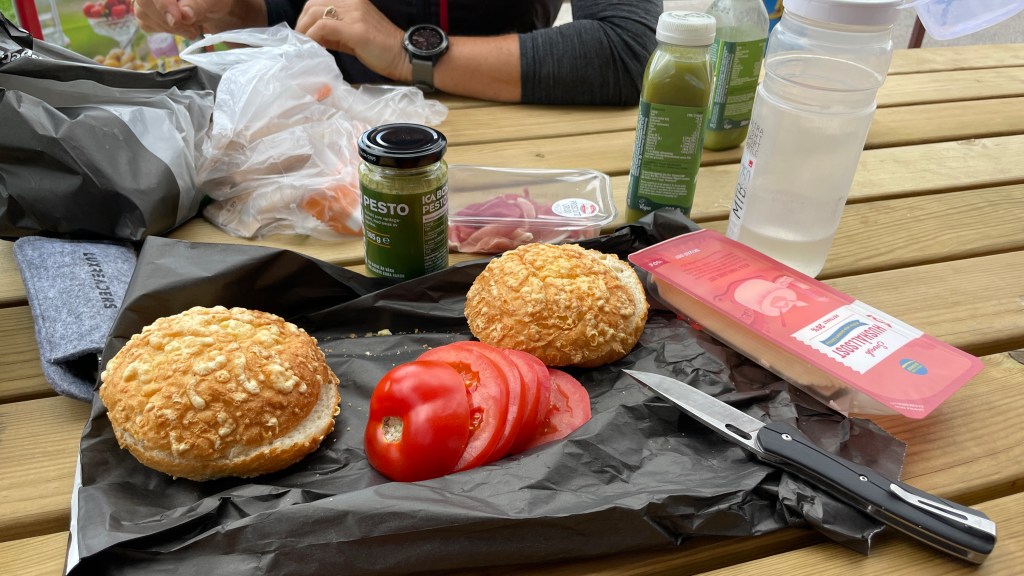 Der var mindre regnbyger, men vi havde jo ikke noget vi skulle nå. Så ved regnbyger stoppede vi op og fandt ly under et træ. Herefter fortsatte turen. Cyklerne var toptunet og navigationen var flydende. Nogen gange kørte vi side om side og småsludrede, særligt når vi kørte i skov. Her var der læ og hastigheden ikke så høj. Hver gang vi ramte åbne områder og asfalt – kom der mere fart på og vi cyklede på skift i front, mens bagerste kunne finde lidt læ. I Ryd (Almundsryd) handlede vi frokost ind i den lokale ICA. Vi havde kørt små 80 km, så en længere pause var kærkommen. Vi var lidt på hjemmebane i dette område, da vi er kommet her meget. Det var et dejligt gensyn og der var ikke sket meget de sidste 5-7 år, siden vi var her sidst.