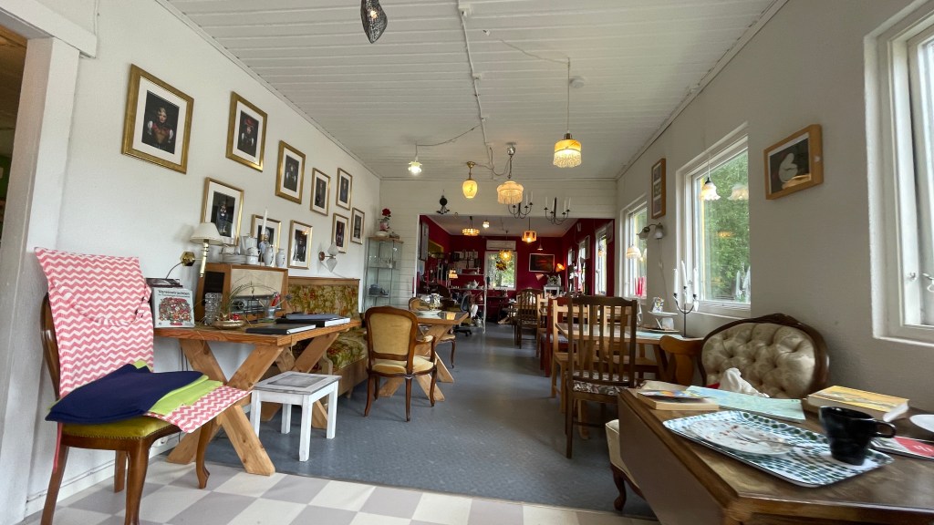Vi cyklede direkte mod Urshult af Banvallsleden. I Urshult fandt vi en cafe, som emmede af nostalgi. Frokosten var indtaget for mindre end en time siden, men der er vel altid plads til lidt lækkert? Det var en lille tidslomme og her fik vi kaffe og kanelsnurre, til næsten ingen penge.