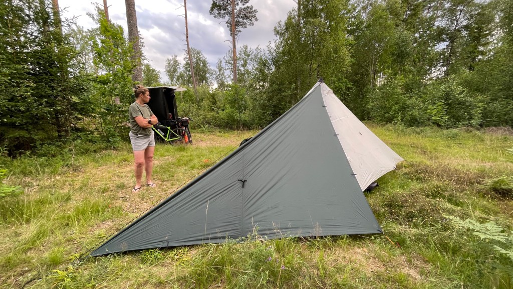 Teltet kom op og vi påsatte en tarp. Forventningen var, at vi skulle vågne op til regnvejr. Hermed havde vi sikret os et lidt større område at pakke ned i- samt kunne spise i tørvejr. Vi badede i søen og jeg skyllede cykeltøjet og det blev hængt til tørre. Maden kom ind og søvnen kom hurtigere denne aften. Det samme gjorde regnen…