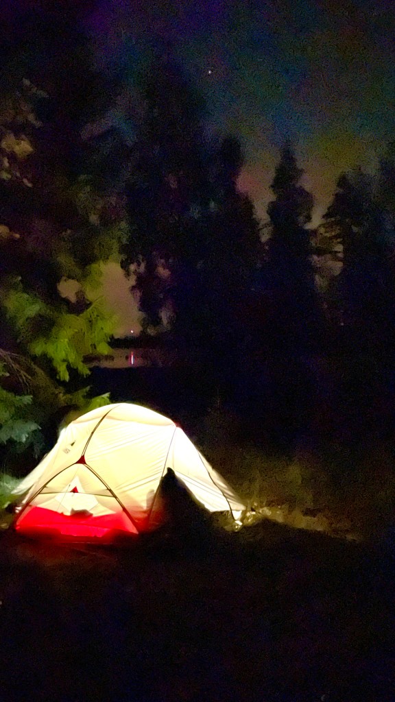 Det blev den aften hvor vi sad længst tid i stilhed og bare nød tosomheden og den natur vi var omgivet af. Teltet på 1400 gram bød ikke på samme balsal, men stadig stort nok til at huse to med deres udstyr. Fordelen ved teltets størrelse var, at når liggeunderlagene var lagt ind, var der ingen mulighed for at de gled fra hinanden. Det betød at hele teltets bund var isoleret, uanset hvor vi satte rumpen. Bålet havde sørget for at vi var gennemvarme og det gjorde en kæmpe forskel for oplevelsen, særligt for Vinni- der har lidt sværere ved at generere varme. Teltets to indgange gjorde det også lettere at få “afvandet” i løbet af natten, uden at vi skulle kravle over hinanden. Vores lejr- dunsko stod klar, for jeg vidste at de ville blive brugt i løbet af natten! De herlige dunsko med gummisål er simpelthen geniale: De vejer ikke meget og holder godt på varmen. Sålen gør at det er muligt at gå rundt i lejren. Jeg forestiller mig også at de er geniale som hyttesko….