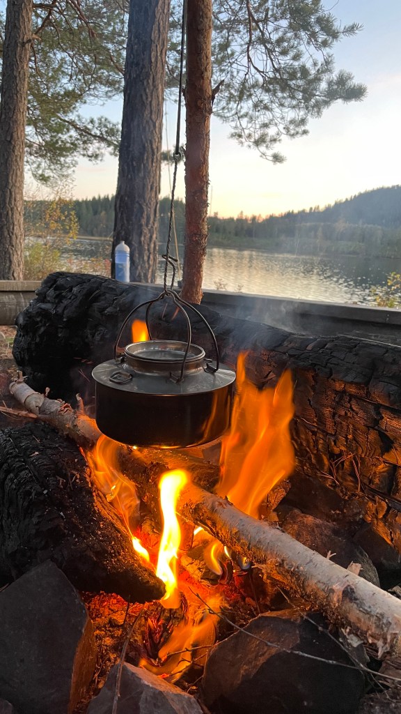 Til trods for 800 gram ekstra vægt, havde vi taget en lille stol med hver. Under tre store grantræer tændte jeg op. Jeg lavede en “tre-buk” som skulle være bålstativ. Bålkedlen dinglede midt ind i flammerne og efter få minutter kogte vandet. Pulvermaden blev tilsat vandet og her sad vi ligesom i en lille sal, hvor gran-grenene var hvælving og taget over os, mens træernes mellemrum blev de store vinduer, med udsigt over søen. Søen lå nu spejlblank og stjernerne sendte sit lys ned på søen, som små lysende diamanter. Varmen fra bålet gjorde det behageligt og vi nød måltidet sammen med en udsigt fra øverste hylde.