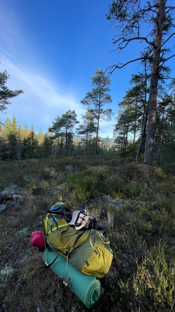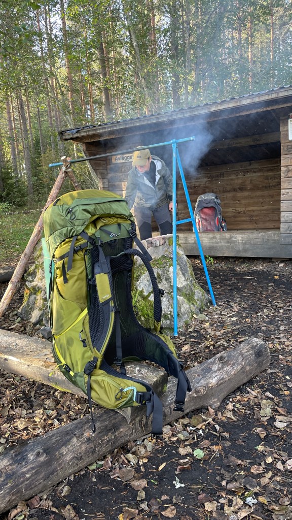 Det blev tid til at pakke campen ned i rygsækkene. Da ruten ikke bød på indkøbsmuligheder ud over ved start, havde vi al mad med til hele turen. Jeg havde håbet på at kunne fange lidt fisk i løbet af turen, men da turistbureauet var lukket for sæsonen, var det ikke muligt at indløse fisketegn. Jeg synes at fornemme at tægen (rygsækken) var lidt lettere her til morgen, nu den var befriet for 4 måltider. Solen skinnede fra en blå himmel og temperaturen krøb opad samtidig med at rimfrosten trak sig tilbage. Vi gik til brønden for at fylde vand på drikkedunkene og derefter gik vi ind på vandrestien igen. Vi gik igennem varieret terræn og stien snoede sig over samtlige toppe og dale. Jeg kunne konstatere at al samtale var forstummet idet underlaget krævede fuld opmærksomhed. Jeg kunne dog høre Vinni udbryde diverse: uh, av, suk- hver gang balancen blev sat på prøve eller hun ikke fik løftet foden højt nok. Jeg kunne mærke hoftebæltet slide på min hud og måtte ofte justere lidt. Ved første hvil besluttede jeg at flytte skulderremmene et hak ned og dermed hæve hoftebæltet 2 cm. Det hjalp så meget at jeg ikke behøvede at justere resten af turen, bortset fra de små opstramninger af remtøjet, der altid vil forekomme.