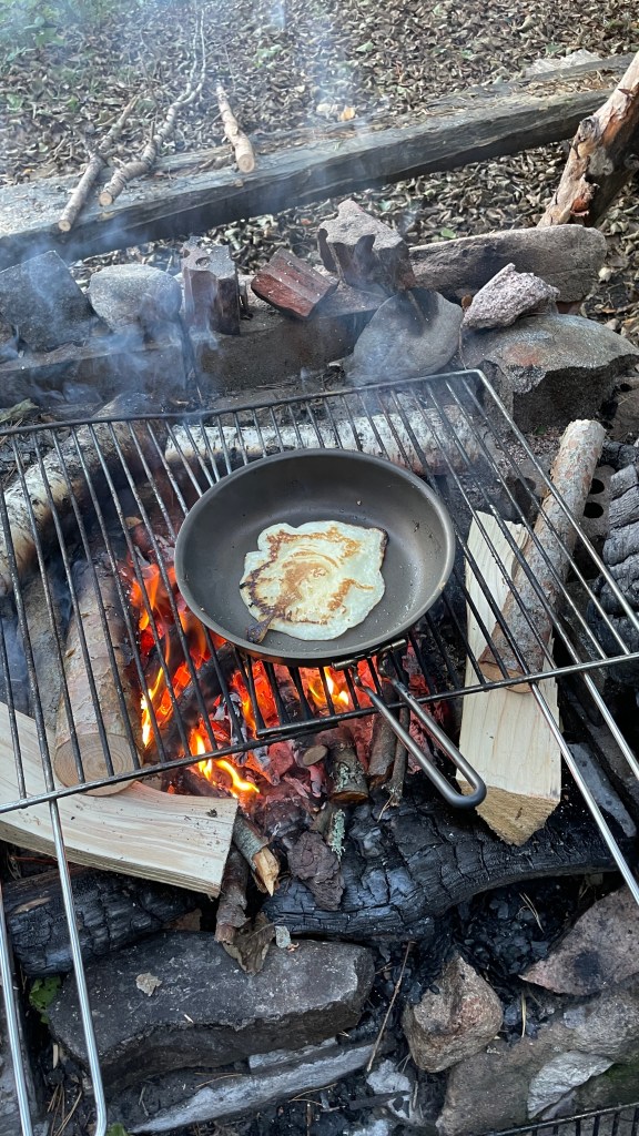 Vi aftalte at lave pandekager. På disse ture har jeg altid en bålkedel og en pande med. Panden giver mulighed for både bøffer, pizza, fisk, røræg og pandekager! Her har vi fundet en arbejdsfordeling: Jeg laver et egnet bål og Vinni er eminent til at styre pandekage stegning på bålet! Det blev en rigtig god eftermiddag og aften, hvor maverne blev fyldt… 🙂