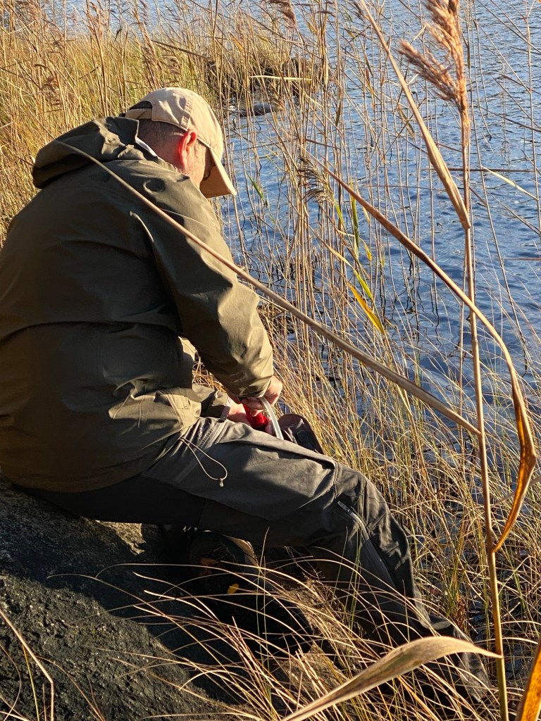 Lejren blev pakket og et besøg på muldtoilettet overstået. Som en lettet mand kunne jeg vandre ubekymret videre. Nattetemperaturen havde været under nulpunktet. Der var overflade is på vandet og hver gang vandrestøvlen trådte ned i en tilfrosset vandpyt, hørtes den sprøde knasende lyd under sålen. Luften var kold og krystalklar. Underskoven blev nærmest flænset i skarpe kontraster mellem solstråler der fandt ned gennem trækronerne, og de steder der stadig lå hen i skygge. Over søen lå tågedisen og dansede en sidste vals, inden solen brændte den væk. I sandheden en magisk morgen! Vi vandrede gennem skoven uden at tale sammen det første stykke tid, indtrykkene skulle lige behandles og bundfældes. På en af de utallige toppe på ruten holdte vi første rul-pause. Her blev morgenens indtryk delt.