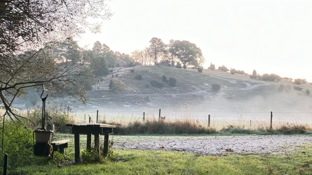 Jeg lå og lyttede til den begyndende fuglesang samtidig med at tågedisen langsomt løftede sit tunge tag og åbenbarede mere og mere af landskabet.