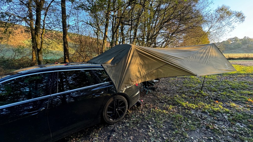 Efter maden kørte vi ud til en lidt afsides P-plads, hvor vi ville overnatte. Jeg havde en tarp, der udgjorde det for en “markise”, således at vi kunne sidde under denne og have et overdækket opholdssted, med en dobbeltseng i bilen.
