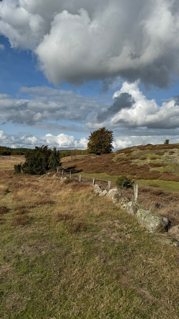 Vandringen var i meget kuperet terræn, men med bløde bakker og afveksling mellem åbne landskaber og skove. Solen varmede tilpas, således at vi kunne undgå alt for meget tøj. Efterårssolen var meget skarp og bidrog til lidt flere rynker i øjenkrogen, idet øjnene måtte knibes noget sammen.