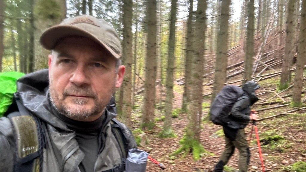 Vi sov længe! Ikke før kl 8 vovede vi os ud. Efter en granskning af YR vejr- ville der være et ophold i regnen ved 10 tiden. Derfor ville vi meget gerne være klar kl 10. Klar til at pakke telt og tarp. Resten skunne gerne være på plads. Planen klappede og vi var klar til at forlade lejren kl. 10.10. Der gikke ikke så lang tid, før regnen kom igen. Men når man først er ude og i gang, er det slet ikke så slemt. Vi gik en lille time og holdt et kort hvil. Vi gik på en ås og pludselig kunne vi høre ti-tusindevis af små fugle der fyldte skovbunden som et bølgende tæppe. Hver gang vi gik fremad, bølgede “fugletæppet” længere frem og ud til siden, mens tæppet lukkede sammen bag os. Det var som en haj midt i en fiskestime, der var altid helt tomt lige omkring hajen. Sådan gik vi i flere minutter og talte højt om oplevelsen. Det havde jeg aldrig oplevet før! Vi fortsatte indtil frokost hvor vi var kommet ind i en samling af gamle huse. En lille tidslomme åbnede sine arme og et kaffe skilt trak os, som en magnet, frem til huset (Guldklump nr. 2).