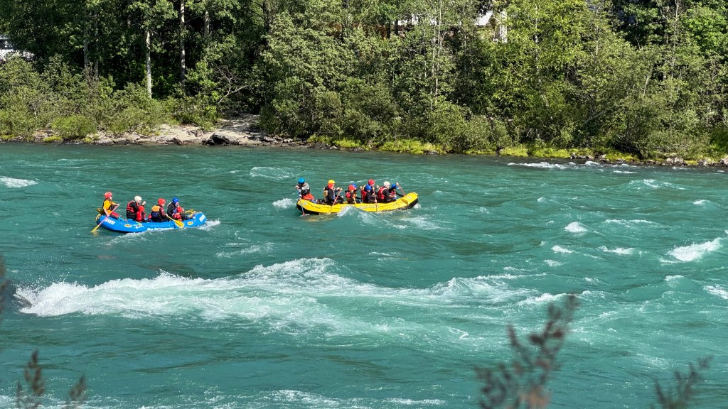 Vi satte kursen mod Rondane, Norges ældste naturreservat. Vi ville dog gerne have en overnatning undervejs. Ruten gik langs Sjoa (elv) en god del at tiden. Her kunne vi virkelig opleve vandets kræfter. Vi kunne se hvordan både kajak (foss) og rafting i store gummibåde var populære aktiviteter. Vi fulgte elven og fandt et egnet sted, med en smuk udsigt. Samtidig var der mulighed for et svalende dyp i elven, hvor vandet var dejligt koldt.