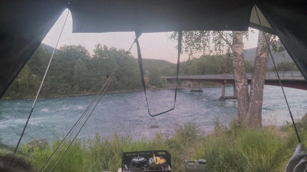 I lejren fandt vi lænestolene og bøger frem. Vi sad nu og skuede ud over den brusende elv, i skygge af et træ og fik læst nogle kapitler.