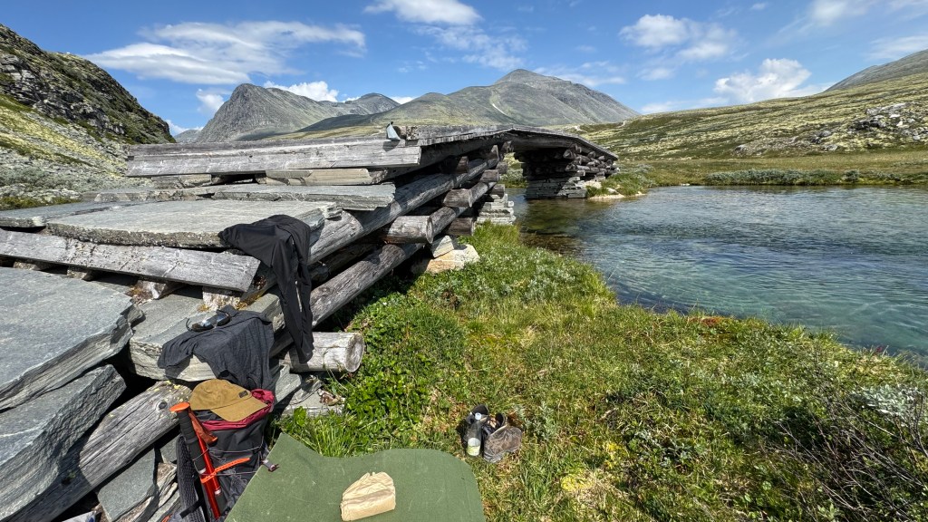 Efter mellemmåltidet gik vi væk fra hytten og andre fjeldvandere. Vi fandt en bro hvor der løb iskoldt smeltevand. Her tilberedte vi pulvermaden. Vi spiser mindre end vi gjorde for 15-20 år siden. På almindelige ture nøjes vi derfor med at dele en enkeltportion, med mindre vi er vintertur (større behov for mange kalorier). Efter maden kontrollerede vi omgivelserne og smed kludene og hoppede i det iskolde vand. Det var skønt og efter få minutter var det så koldt at det gjorde ondt. Vi lagde os i skyggen og snuppede en lille “morfar”.
