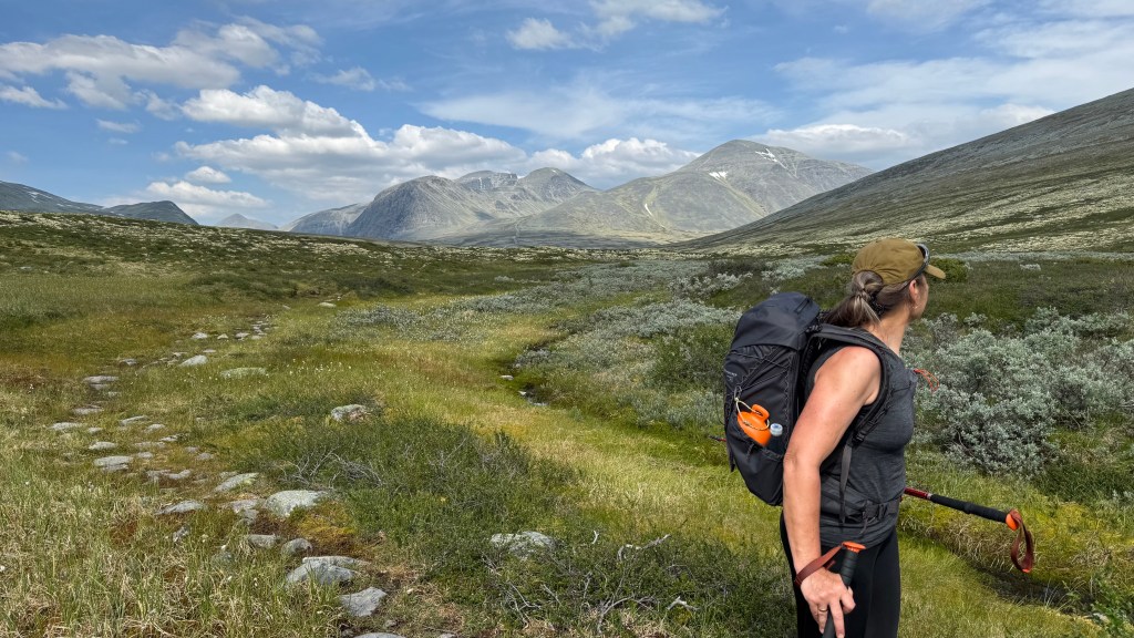 Vi pakkede en rygsæk hver og monterede vandrestøvlerne. Dagens etape ville være ca. 15 km. Med i rygsækken var kogegrej, førstehjælpstaske, nødbivuak, mad, chokolade, dunjakke, regnjakke og hue/vanter samt vand. I fjeldet kan man sagtens blive overrasket af dårligt vejr. Skiftet kommer ofte meget hurtigt. Jeg orienterer mig hele tiden mod himlen 360 grader rundt. Men denne dag bragede solen ned og kun 2-3 m/s vind.