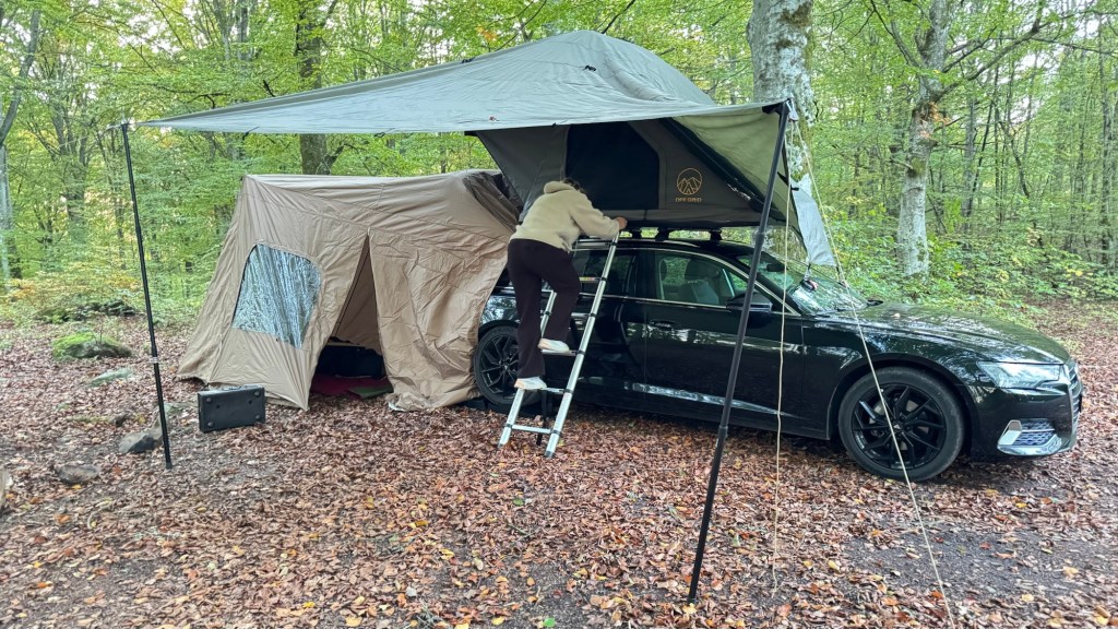 Efter fyraften blev alt grejet smidt i bilen og tagteltet monteret. Jeg havde brugt lidt tid på at isolere bunden af tagteltet bedre. Hermed skulle det være ganske behageligt at overnatte, selv under køligere forhold. Tagteltet ville udgøre første camp, idet vi sikkert ville nå sent frem. Tagteltet er opsat på mindre end 2 minutter. Det er let at komme i køjen, såfremt at bilen er parkeret et godt (og lovligt) sted. Vi har erfaret at svenskerne er blevet opmærksomme på autocampere der parkeres alle mulige og umulige steder. I de senere år er der kommet massivt flere bomme på skovveje, samt endnu flere skilte med forbud for indkørsel. Jeg tænker at svenskerne er blevet godt trætte af autocampere!