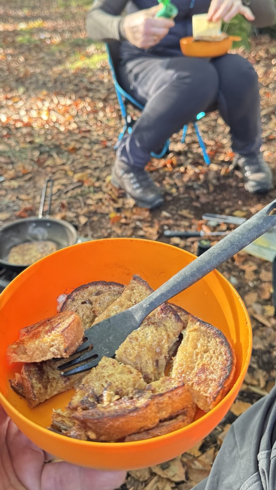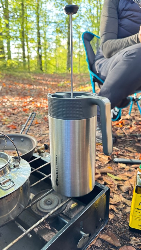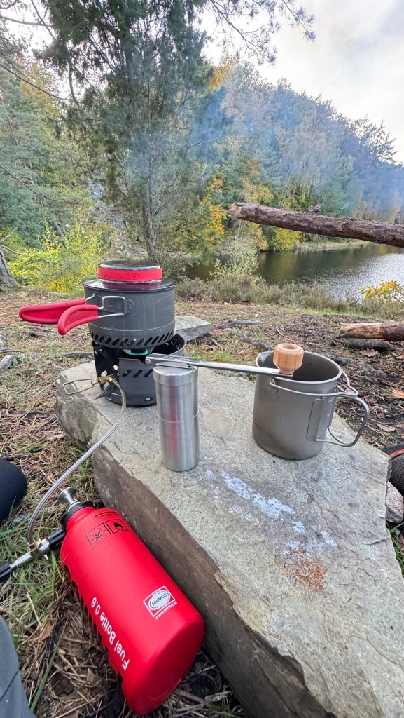 Trods vi gik relativt tidligt i seng, stod vi først op ved 8 tiden. Der var ingen grund til at skynde sig, mere end nødvendigt. Vinni lovede “arme riddere” og jeg klarede kaffen. Min gamle GSI stempelkande havde udtjent sin værnepligt. To nye var indkøbt: En GSI isoleret stål stempelkande, med kaffe til 4 kopper og en titaniums stempelkande, med indhold til to kopper . Vi spiste også en gang müsli, for at være sikre på, at der var nok brændstof på motoren. Vi gav os god tid til at nyde både maden og omgivelserne. Jeg viste ruten på kortet og vi begyndte at finde grej, tøj og mad frem. Det hele blev fordelt og rygsækkene pakket efter egne præferencer. Jeg tænker ikke længere over, hvor det forskellige grej placeres i rygsækken. Det meste har sin faste plads, og dagens vejr og rute afgør, hvor specifikke genstande placeres. Er det koldt ligger dunjakken placeret, således den kan komme frem under pauser. Er det på kanten af regn, er regnjakken lige til at finde frem i en fart.