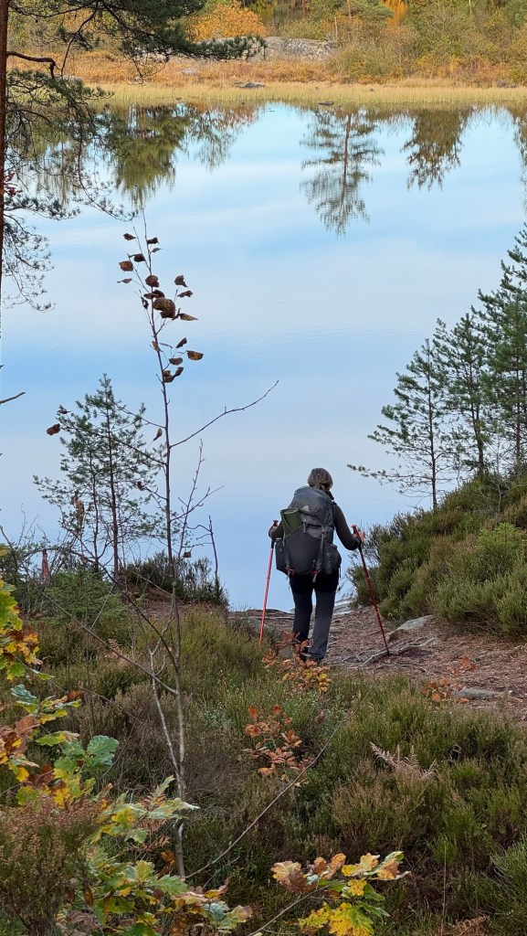 Solen hilste os velkommen og varslede en smuk efterårsdag. Vi gik roligt frem. Min tå sendte hjernen besked: “jeg er her stadig og er du sikker på at det er en god ide?”. Men efter en lille times vandring var det som om at tingenes tilstand blev accepteret. Varmen bredte sig til hele kroppen og rygsækken sad glimrende. Jeg lynede fjeldbukserne lidt op, så der kom lidt luft ind til lårene. Vi gav os god tid og stoppede gerne op og nød sceneriet. Orienteringen gik efter bogen og sikkert åd vi ruten. Meter bliver til kilometer og minutter til timer. Vi glemte at holde første hvil efter 50 minutter og stoppede første gang efter to timer. Måske var jeg også lidt betænkelig ved at stoppe op. Men nu måtte gætteriet stoppe. Enten ville det blive lort at komme igang igen, eller bare være helt ok. Det blev ikke noget problem. Jeg sendte en venlig tanke til min læge. Jeg havde valgt ikke at tage noget mod smerterne, for bedre at have føling med min krop.