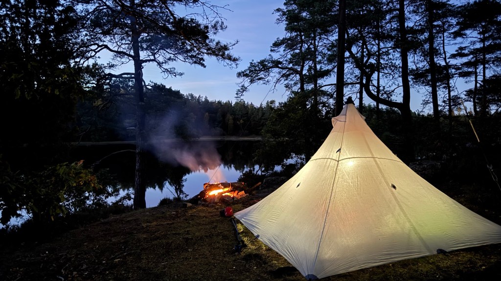 Sidst på eftermiddagen ramte vi et super spot. En lille klippehalvø lå smukt i den spejlblanke skovsø. Det tog ikke mange sekunder at blive enige om, at vi havde fundet et perfekt sted. Hurtigt blev teltet opsat. Her var både brænde og vand. Jeg gik ned til søen med vandrensnings-sættet. Hustruen samlede brænde. På vej tilbage samlede jeg optændingsbrænde. Bålet blev tændt og inden længe kunne vi nyde varmen fra bålet. Bålets “krydderi” fik jeg også i store mængder. Efter nogle minutter måtte jeg finde et bedre sted at sidde. Da jeg lettede røven, forsvandt røgen naturligvis. Det var som om moder natur lige ville informere mig om, hvem der får det sidste ord.